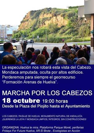 Los colectivos finalizan recordando su convocatoria de una nueva acción mañana viernes 18 de octubre, una “Marcha por los Cabezos”, que partirá a las 19:00 horas de la Plaza del Piojito, a los pies del Cabezo de San Pedro y recorrerá diversas calles vinculadas a la historia de la ciudad y a los cabezos amenazados hasta terminar en la plaza del Ayuntamiento. “Se trata de una actividad abierta a toda la sociedad, a todas las edades, fácil de recorrer. Será reivindicativa pero también con una gran carga cultural, con especialistas que nos irán contando la importancia de conservar los Cabezos de forma natural, con su biodiversidad, con sus vestigios culturales, limpios, sin construcciones. Recordamos la amenaza real que se cierne sobre estos elementos que queremos declarados Monumento Natural. Pedimos reaccionar ante la dejación de funciones de la Administración. Animamos a romper el silencio cómplice igualmente responsable de la destrucción de nuestro paisaje cultural. En La Joya, en Mondaca, Huelva se juega su identidad, su oportunidad de convertirse en una ciudad patrimonial, verde y moderna. Huelva se juega su futuro” terminan.
