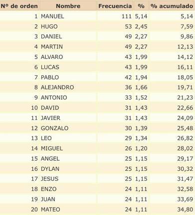Para tener una lista más amplia, estos serían los 20 nombres más comunes puestos en 2020 en toda la provincia: