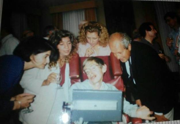 En la imagen se puede observar a Stephen Hawking junto a las periodistas Mari Ángeles Puente, Mari Luz Ortega, el alcalde Juan Ceada y la actual secretaria del alcalde onubense, Beatriz Mancha durante su visita a la Peña Flamenca.