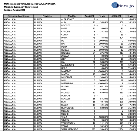 La matriculación de vehículos durante el mes de agosto continúa a la baja en Huelva. La provincia sigue la tendencia estatal y cierra el mes con números rojos. Se convierte así en el primer mes, después de iniciada la pandemia de la COVID19, en el que se registran menos matriculaciones comparado con el mismo periodo de 2020.