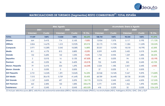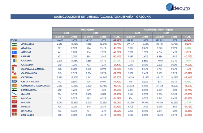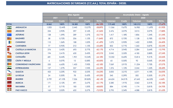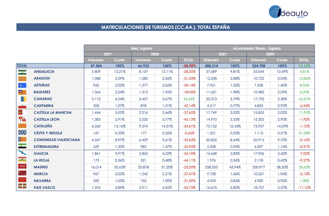 En concreto, las matriculaciones de turismos y todoterrenos registran una fuerte caída de las entregas, con un descenso de las ventas del 29%, hasta las 47.584 unidades vs agosto 2020, cuando se matricularon 66.923 unidades.