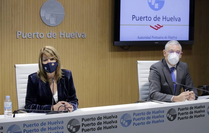 Pilar Miranda, acompañada por el director del Puerto de Huelva, Ignacio Álvarez-Ossorio, ha anunciado la previsión de puesta en marcha durante el primer trimestre de 2022 de una nueva línea marítima regular entre el puerto onubense y Marruecos y otra línea regular con Reino Unido antes del verano.