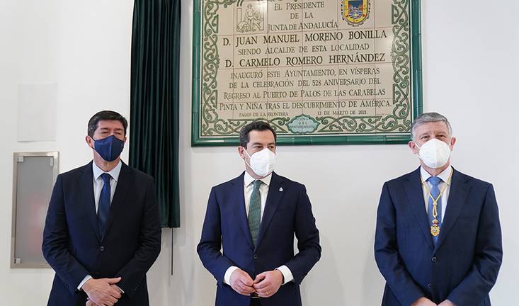 Ayuntamiento de Palos de la Frontera, en Huelva. Allí ha aseverado que en Andalucía reina una calma que es propicia para los intereses de los ciudadanos y ha indicado que desde la estabilidad y la certeza se construye el futuro de nuestra comunidad.
