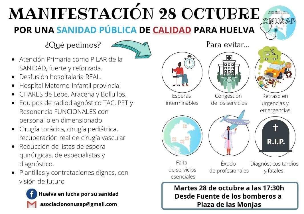La plataforma Onubenses Unidos por una Sanidad Pública de Calidad (ONUSAP) ha convocado para esta tarde una gran manifestación en Huelva con el objetivo de denunciar la situación “límite” que, aseguran, atraviesa la sanidad pública en la provincia.