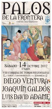 El sábado 14 de octubre a las 18:00 horas, los amantes de la Fiesta Nacional tienen una cita en el Coso Del Descubrimiento de Palos de la Frontera. La VIII Corrida Pinzoniana de Palos cuenta con un cartel con mucho sabor iberoamericano, como guiño al Aniversario del Descubrimiento de América. En él, se anuncia el rejoneador hispanoluso Diego Ventura, el peruano Joaquín Galdós y el mexicano Luis David Adame.