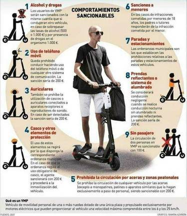 - Los VMP se consideran vehículos, por lo que están obligados a cumplir las normas generales de circulación como lo hacen los demás vehículos (alcohol, droga, prioridad, alumbrado, prohibición de uso de teléfono móvil, auriculares, etc.). Quedan excluidos los vehículos para personas con movilidad reducida.