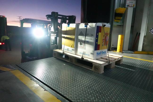 Técnicos de la Agencia Española del Medicamento y Productos Sanitarios (AEMPS) ha firmado la recepción de esta primera entrega. Se trata de lotes de la vacuna desarrollada por los laboratorios Pfizer y BioNTech, destinados a los países de la Unión Europea, que salieron el miércoles en contenedores térmicos de la planta belga de Puurs y que ya se encuentran en un almacén de Guadalajara.