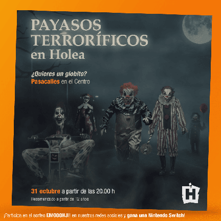 En el Centro Comercial Holea, el próximo 31 de octubre Holea será el escenario de una pesadilla terrorífica. Unos payasos diabólicos tomarán el centro en las vísperas de la sobrecogedora noche de Halloween. El pasacalles comenzará a las 20.00 horas y realizará un recorrido por ambas plantas. Los más pequeños podrán disfrutar también de actividades con la temática Halloween en el Hache Miniclub, con el taller 'Dulces monstruosos' el jueves 31 de octubre y el viernes 1 de noviembre a las 17.30 y a las 19.00 y con el taller 'Disfraces de miedo' el día 1 a las 11.00 y a las 12.30 horas. Para estas actividades gratuitas, los niños tendrán que apuntarse previamente en el Punto de Atención al Cliente.
