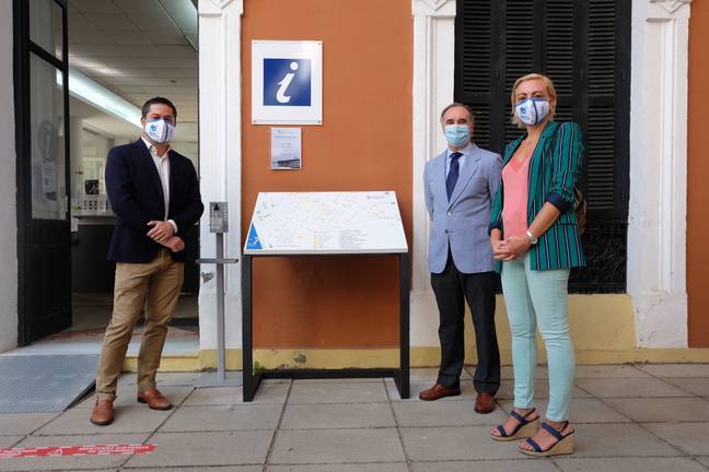 El concejal de Turismo, Promoción de Huelva en el Exterior y Universidad, Francisco Baluffo; la concejala de Comercio y Mercados, Tania González; y el delegado territorial de Transformación Económica, Industria, Conocimiento y Universidad de la Junta de Andalucía, Antonio Augustín; han presentado hoy este plano ante los medios de comunicación un panel que provisionalmente se ha instalado en esta ubicación, junto a un dispensador de gel hidroalcohólico, si bien una vez se levanten las restricciones de la alerta sanitaria, este plano se dispondrá en los exteriores de la Casa Colón, en El Punto, como referencia de partida hacia las calles peatonales de este foco comercial.