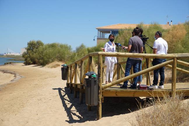 La alcaldesa de la localidad ayamontina, Natalia Santos, acompañada por la concejala responsable de Playas, Rosario de los Ángeles, ha inaugurado en la mañana de este viernes la primera Playa Canina de Ayamonte.