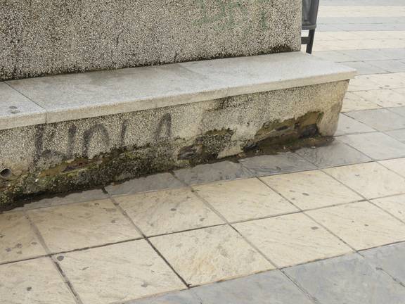 - En los bancos de las jardineras podemos ver a simple vista la tela asfáltica degradada o directamente arrancada, por la falta de material también dejando los hierros salientes.