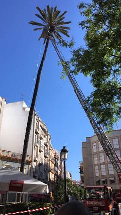Los técnicos de Parques y Jardines se afanan en la limpieza de la emblemática palmera que da el nombre popular a la Plaza Quintero Báez. Durante la mañana, un camión de bomberos ha desplegado una larga escalera para facilitar a los operarios llegar a la cúspide de la palmera y poder así quitar las hojas secas y sanearla. Con esta actuación, el árbol más alto de la ciudad, que supera los 25 metros de altura, luce remozado de cara al verano y se evita el peligro de posibles caídas de ramas.