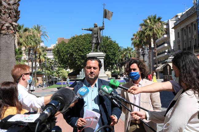 El portavoz Popular ha presentado esta batería de medidas sociales en la Plaza de Las Monjas, junto a la escultura a Cristóbal Colón, al que se ha referido como un “símbolo de la ciudad” tras la polémica que ha suscitado en la última semana.