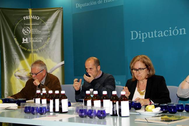 Las dependencias de la Diputación de Huelva han acogido hoy la cata profesional, realizada por expertos catadores de reconocido prestigio, de los aceites de la cosecha 2017/2018 que se han presentado a la convocatoria del V Premio Diputación de Huelva al Mejor Aceite de Oliva Virgen Extra (AOVE) obtenido en la Provincia de Huelva que, como en convocatorias anteriores, se enmarca dentro de la campaña “Que sea de Huelva”, si bien este año, por primera vez, y dentro de este V premio, se ha convocado una Distinción Especial al mejor packaging de AOVE de la provincia de Huelva, que también ha sido fallado hoy.