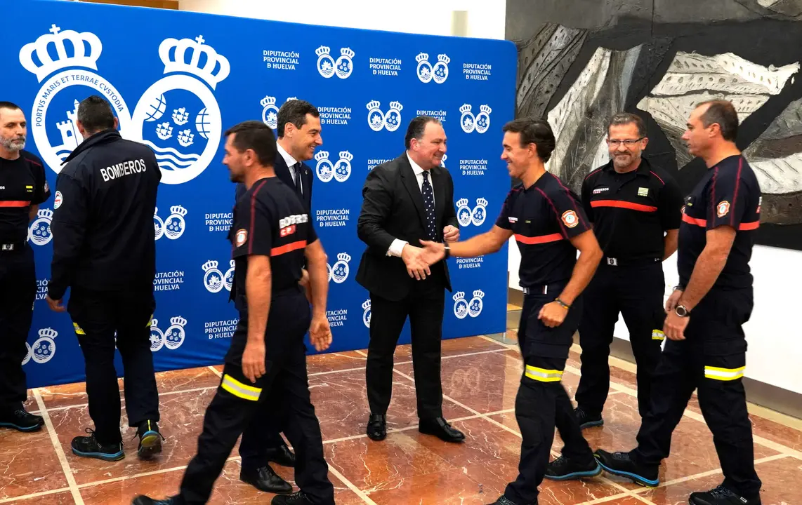 Los presidentes de la Junta de Andalucía y de la Diputación agradecen a los Bomberos de Huelva su solidaridad con Valencia. Juanma Moreno y David Toscano destacan la profesionalidad y la labor humanitaria de los efectivos, en una recepción al regreso del segundo contingente