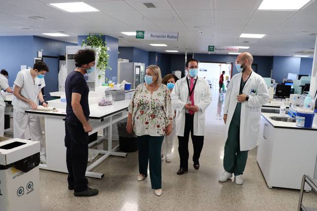 La delegada de Salud y Familias, Manuela Caro, acompañada por el director gerente del hospital, José Luis Bonilla, ha conocido hoy de cerca el trabajo que desarrolla este servicio referente en la provincia y a nivel andaluz para el análisis y la confirmación de las sospechas clínicas mediante PCR a la población y que constituye un auténtico faro de vigilancia en la detección de brotes, de Covid-19 o de cualquier otro agente infeccioso, dando la voz de alerta cuando compromete la salud pública de los ciudadanos. Durante la visita, ambos responsables sanitarios han agradecido a todos los profesionales sanitarios y no sanitarios del centro hospitalario su ingente esfuerzo y dedicación desde que se decretó el estado de alarma.