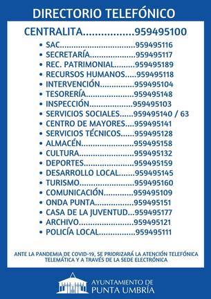Así, toda la atención a la ciudadanía se realizará a través del número de teléfono 959495100, de la sede electrónica municipal (https://umbria.sedelectronica.es) y del email sac@puntaumbria.es.