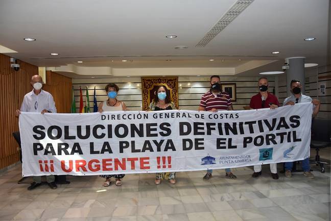 La alcaldesa de Punta Umbría, Aurora Águedo Borrero, junto al concejal delegado de El Portil, Luis Manuel Alfonso, y representantes de las dos asociaciones vecinales del núcleo urbano, se han unido esta mañana para pedir a las administraciones competentes de forma conjunta “una solución para las playas de El Portil”.
