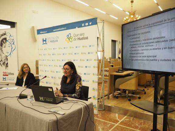 La rectora de la Universidad de Huelva se ha referido a continuación al debate sobre la capitalidad de la provincia de Huelva, a la que aspiraron los municipios de Trigueros, Valverde, Ayamonte, Moguer, tras lo que ha indicado que la nueva división provincial, con Huelva como capital, se consagró en el decreto de 27 de enero de 1822. Poco más de cinco meses después, el 7 de julio de 1822, se constituye por primera vez la Diputación Provincial de Huelva.