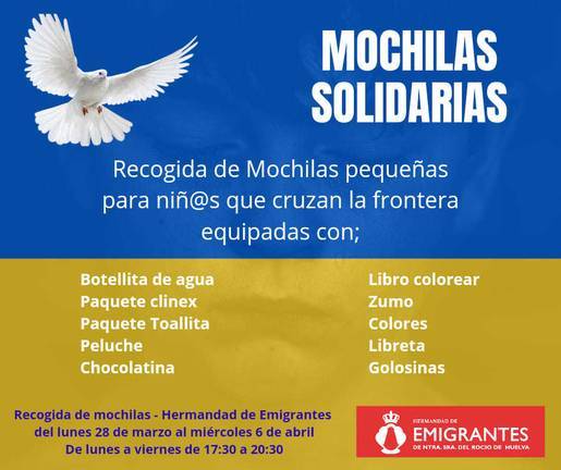Asimismo, la Hermandad de Emigrantes, en coordinación con la ONG Liliowa5, está organizando una expedición a la ciudad polaca de Lublin para llevar estas ‘Mochilas solidarias’ y víveres de supervivencia (medicamentos, linternas, pilas, comida en lata, sacos de dormir, etc.), de ahí que también se realice un llamamiento para que aporten todo aquel material que pueda ayudar a mitigar estos tiempos tan difíciles que están viviendo nuestros hermanos.