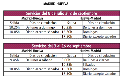 Durante los domingos de julio y agosto habrá, por tanto, tres salidas de Huelva: a las 10.25, 16.20 y 17.50 horas; y dos de Madrid Puerta de Atocha: a las 10.25h y 18.05h.