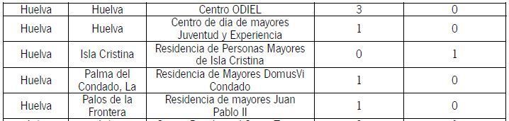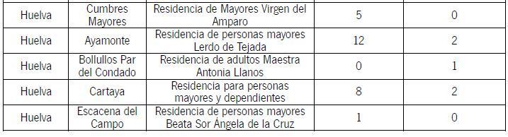 Las residencias onubenses con casos confirmados en esta fecha de finales de agosto, cuando fueron tomados los datos aunque publicados el 3 de septiembre, son las de Lerdo de Tejada (Ayamonte), con 12 casos en residentes y dos trabajadores diagnosticados; Cumbres Mayores, con 5 residentes infectados; Residencia para Adultos Antonia Llanos (Bollullos), un trabajador afectado; Residencia de Mayores Dependientes (Cartaya), con 8 residentes afectados y 2 trabajadores; Beata Sor Ángela (Escacena), 1 caso en residente; Centro Odiel (Huelva capital), tres residentes afectados; Centro de Día de Mayores Juventud y Experiencia (Huelva-capital), un residente afectado; Residencia de Personas Mayores (Isla Cristina), un trabajador afectado; DomusVi (La Palma), un residente afectado; y Residencia Juan Pablo II (Palos), 1 residente afectado.
