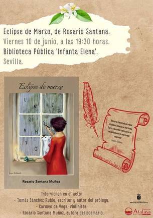 La escritora riotinteña Rosario Santana Muñoz presentará en Sevilla su quinto libro, 'Eclipse de marzo'. La cita tendrá lugar el próximo viernes 10 de junio, a partir de las 19.30 horas, en la Biblioteca Infanta Elena. En el acto participarán, además de la autora, Tomás Sánchez Rubio, escritor y autor del prólogo y Carmen de Vega, que amenizará la tarde con sus acordes al violín.