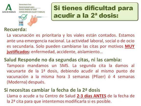 En cuanto a la cita para la administración de la segunda dosis, no podrá solicitarse por estas vías y se facilitará en la mayoría de los casos en el momento de la vacunación o será comunicada con posterioridad por su centro sanitario vía sms o llamada telefónica, pudiendo consultarse en ClicSalud+ en el apartado ‘Mis Citas’.