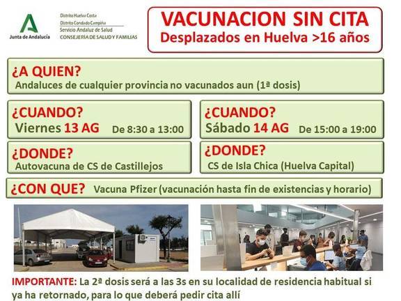 En el caso de Huelva, la vacunación sin cita se realizará en dos sesiones, una mañana mismo, 13 de agosto, en el punto de autovacunas del consultorio de Villanueva de los Castillejos, al que pueden acudir los usuarios desde las zonas costeras cercanas, en horario de 8,30 a 13.00 horas y el próximo sábado, 14 de agosto, en el centro de salud de Isla Chica, de 15.00 a 19.00 horas.