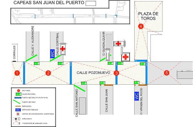 Los días y horarios en los que estarán activado el Cecor serán del 19 al 23 de junio de 12.30 a 14 ó fin del encierro, y de 18:30 a 22:30 o fin de las capeas. Estará ubicado en la planta alta del Colegio San Juan Bautista, siendo la planta baja para el hospital de campaña. Las dos ambulancias estarán en las calles San Antonio y Guadalquivir, así como el todoterreno con un van que se utilizará para el transporte de los animales.
