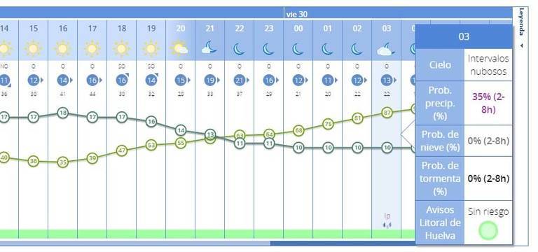 De momento, las probabilidades lluvias se encaminan entre las 2.00 y las 8.00 horas, Aemet señala en cada una de las horas un 35% de probabilidades de precipitaciones, aunque en todo el periodo las probabilidades de que en algún momento de la madrugada llueva son del 75%. Eso sí, a priori, parece que la amenaza se cierne más sobre el Nazareno en la Madrugá que sobre las cuatro hermandades del Jueves Santo.