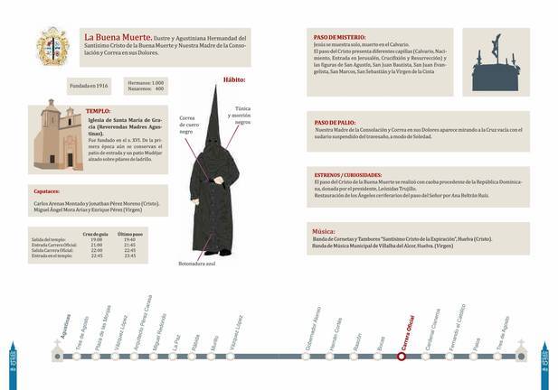 La Ilustre y Agustiniana Hermandad del Santísimo Cristo de la Buena Muerte y Nuestra Madre de la Consolación y Correa en sus Dolores tiene prevista este año su salida a las 19.0o horas desde la Iglesia conventual de Santa María de Gracia o Las Agustinas; su recogida está prevista a las 23.45 horas, tras un recorrido que toca las principales calles del centro de Huelva. 400 nazarenos acompañarán al Paso de Misterio de Jesús muerto en el monte Calvario y el paso de palio de Madre de la Consolación.