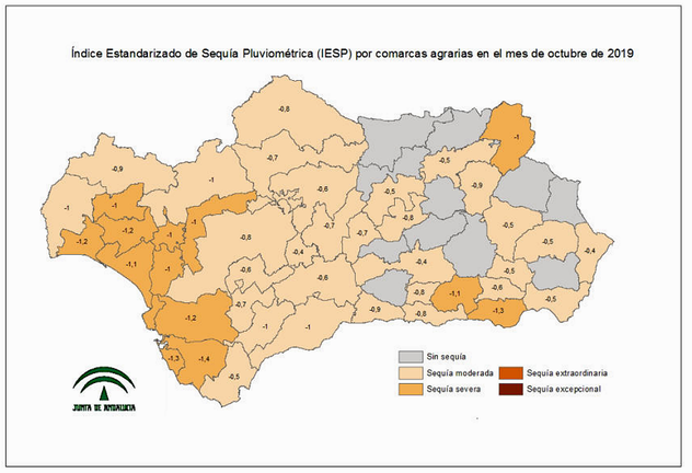 Llueve pero poco - 6,4 mm en Huelva capital y más de 10 mm en Moguer durante la mañana del miércoles, según Meteohuelva- para paliar la sequía que padece la provincia de Huelva desde hace varios meses. Cuatro comarcas onubenses sufren ya sequía severa. Son el Ándevalo Oriental, el Condado Campiña, el Condado Litoral y la Costa. El resto, la Costa Occidental y la Sierra, padecen sequía moderada, según el estudio de la Consejería de Agricultura, Ganadería, Pesca y Desarrollo Sostenible referido al mes de octubre.
