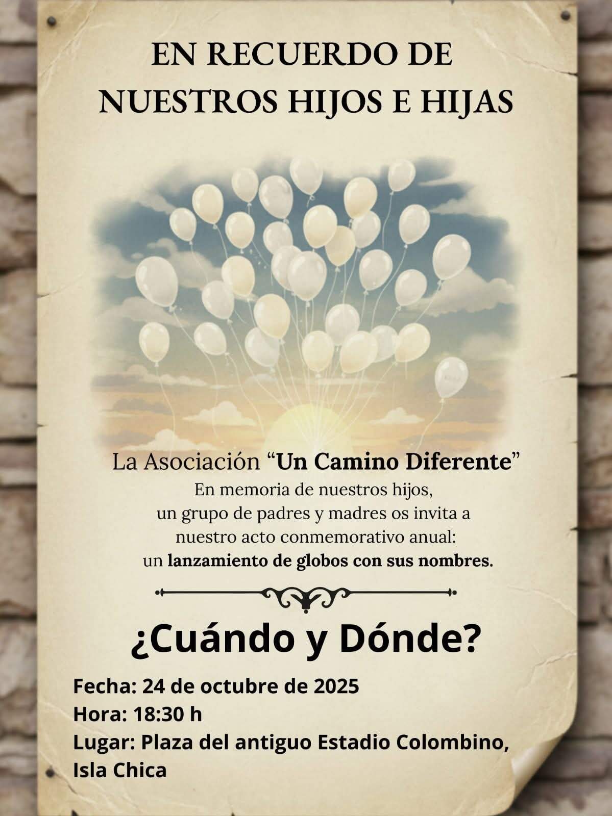 La Asociación “Un Camino Diferente”, formada por padres y madres que han perdido a un hijo o hija, celebrará este viernes 24 de octubre a las 18:30 horas una suelta de globos en la plaza del antiguo Colombino, en Isla Chica, como homenaje a la memoria de sus seres queridos.