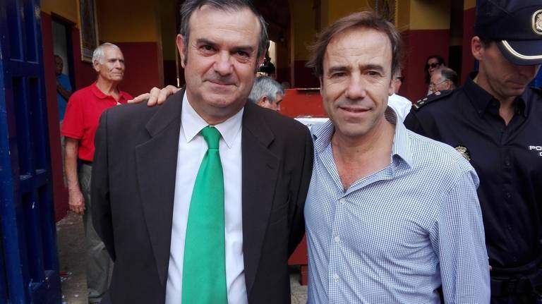 Juan León, presidente de los festejos taurinos del coso mercedario y el matador de toros Emilio Silvera, se estuvieron saludando en la puerta grande. El torero, está feliz con la actuación de su hijo en las presentes Colombinas, donde abrió la puerta grande a pesar de ser la primera vez que se vestía de luces esta temporada. Suerte Emilio junior