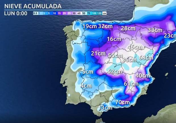 En el interior peninsular lo más relevante serán las nevadas copiosas en amplias zonas. Ya se están produciendo en el cuadrante sureste de la Península y algunas zonas del centro.