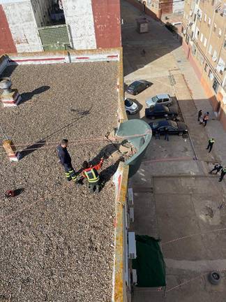 De esta forma, desde primera hora de la mañana, los bomberos están procediendo a asegurar el perímetro, tanto mediante el acordonamiento de la zona de vía pública situada en la vertical del edificio, mediante cinta de señalización, para evitar el paso de peatones; como mediante el afianzamiento de los distintos elementos en fachada para evitar el vuelco de elementos a la calle.