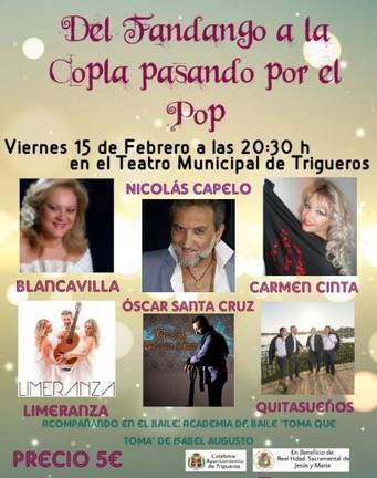 El próximo viernes 15 de febrero a las 20:30 horas en el Teatro Municipal de Trigueros tendrá lugar la gala 'Del Fandango a la Copla, pasando por el Pop' a beneficio de la Real Hermandad Sacramental de Jesús y María.