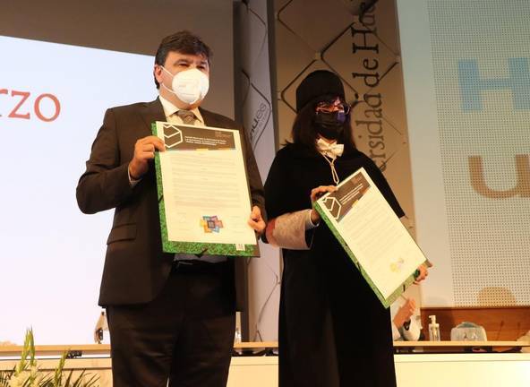 La ceremonia, radicalmente diferente a la que se celebrara hace justo un año, a las puertas de la devastadora pandemia, ha podido seguirse en streaming, y ha contado con una presencia física reducida por seguridad sanitaria, y el acto ha sido presidido la rectora de la Onubense, María Antonia Peña, acompañada en este aforo limitado por los representantes de la Dirección General de Universidades, del Consejo Social, la Subdelegación del Gobierno, la Delegación Territorial de la Junta de Andalucía, del Sistema Andaluz de Salud (SAS), de la Asociación de Antiguos Alumnos 3 de marzo (3M), instituciones como la Autoridad Portuaria onubense, y con la participación del alcalde de Huelva, Gabriel Cruz, con quien la rectora ha rubricado el manifiesto del proyecto ‘Huelva, Ciudad Universitaria’.