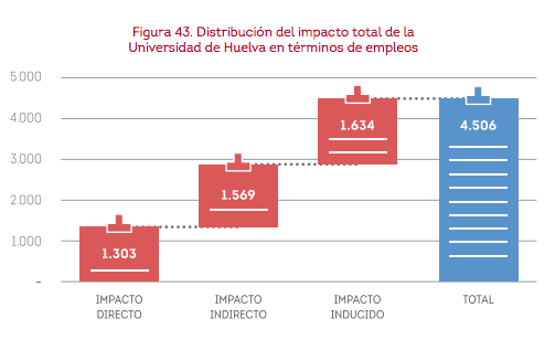 Si nos remitimos a datos globales de repercusión económica, tal y como se puede leer en la página 64 del informe, el Valor Añadido Bruto (VAB) adicional generado (indirecto e inducido) se estima en 171 millones de euros, lo que supone un efecto multiplicador total de 4, es decir, por cada euro de valor añadido que genera la Universidad de forma directa, se generan 4 euros en el resto de la economía provincial.