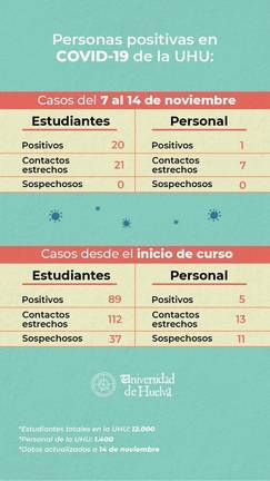La Universidad de Huelva ha notificado una nueva cifra de positivos por Covid-19. Concretamente, la universidad ha informado de que existen 21 nuevos casos en los últimos siete días (desde el 7 de noviembre al 14 de dicho mes).