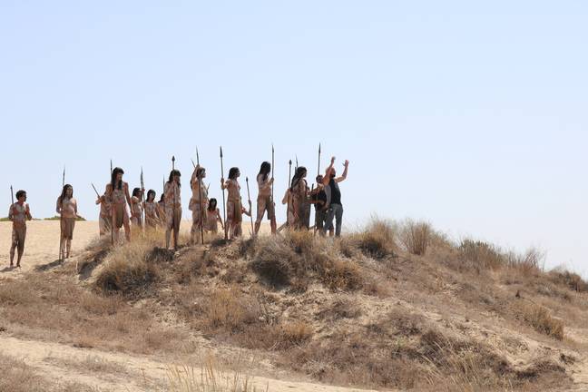 Desde la distancia contemplan la recreación del desembarco en la isla de Mactán de los navegantes españoles, hace ahora 500 años, y de la batalla que estos protagonizaron con los nativos de la Isla, hechos que han cambiado por unos días el paisaje de la playa cartayera. Las carpas, sets de rodaje y cámaras han sustituido a las habituales sombrillas, mientras que los bañistas han sido sustituidos por navegantes españoles de hace cinco siglos, armados con lanzas, y por indios nativos con arcos y flechas.