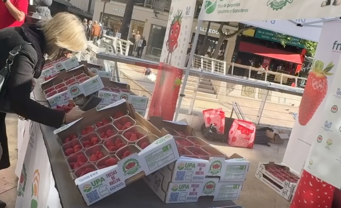 La Unión de Pequeños Agricultores (UPA) de Huelva ha llevado a cabo este miércoles una acción promocional en la plaza de Els Pinazos, en Valencia, donde se han repartido de forma gratuita más de 500 tarrinas de fresas con el objetivo de fomentar el consumo de producto nacional.