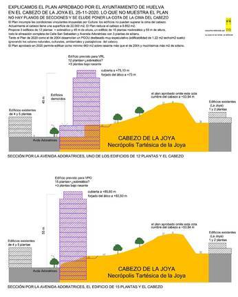 - La elevadísima edificabilidad del sector se concentra en la ordenación de 2020 en tres edificios de 12 plantas y más de 45 metros de altura, que superarán la cima del cabezo hasta unos 20 metros (equivalente a un edificio de más de 6 plantas) y un edificio de 15 plantas y 55 metros de altura que superará en unos 30 metros la cima del cabezo (equivalente a un edificio de 10 plantas). Sorprende que el Pan Especial aprobado por el Ayuntamiento en 2020 no tenga ni una sección de la ordenación ni indique la cota de la cima del cabezo, como sí hace la ordenación de 2004. Se está omitiendo de forma intencionada una información esencial para analizar los impactos de la ordenación en un espacio protegido y en su entorno urbano, donde las volumetrías y las cuencas visuales son determinantes para evaluar la compatibilidad del plan con los valores a preservar. Huelva te mira ha elaborado unas secciones con los impactos de las torres de 12 y 15 plantas en su relación con el cabezo, en base a la información del plan aprobado en 2020 y de la topografía del cabezo que sí aparece en la ordenación de 2004.