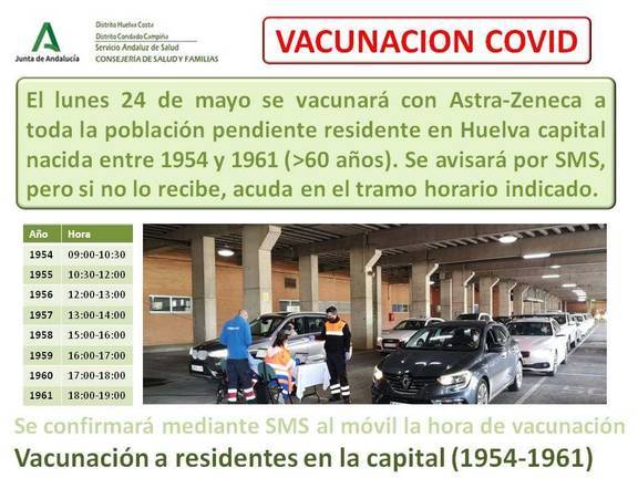 Quedan 2.370 personas de 60 a 67 años sin vacunar en Huelva a los que les corresponde por edad hacerlo con Astra Zeneca. Se citarán por SMS a su móvil el día 24 de mayo en el Estadio Colombino, pero si no tiene móvil o si no lo recibe por algún motivo, puede acudir en su vehículo a vacunarse en el tramo horario para su franja de edad (1961 a 1954), identificándose a la entrada en el punto de control de Protección Civil.