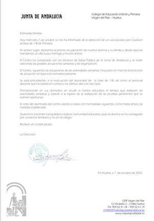 El Colegio de Educación Infantil y Primaria Virgen del Pilar de la capital ha informado hoy de su primer positivo por coronavirus en sus aulas. En un comunicado enviado a las familias, se ha informado de la detección de un caso positivo en la clase de Primero B de Primaria.