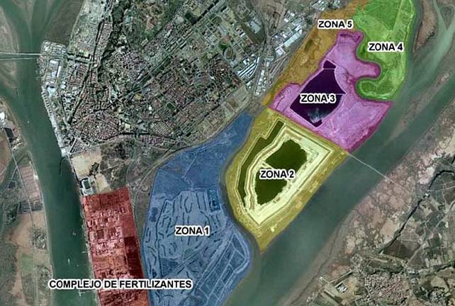 Antiguas marismas donde se han ido vertiendo los residuos procedentes de Fertiberia y de otras industrias, incluso residuos radiactivos procedentes del escandaloso accidente de Acerinox, detectado en Europa antes que en España cuando llegaron allí los efluvios de la radiactividad.
