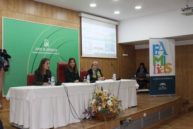 La delegada del Gobierno de la Junta de Andalucía en Huelva, Bella Verano; la secretaria general de Familias, Ana Mata, y la delegada territorial del ramo, Manuela Caro, han asistido al acto organizado para dar a conocer esta herramienta informativa a distintos colectivos y asociaciones de la provincia onubense.