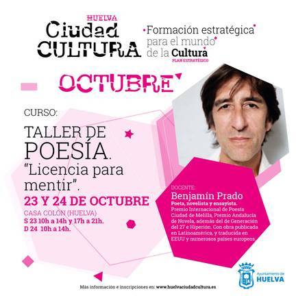 Así, para esta propuesta del mes de octubre se contará con Benjamín Prado, novelista, ensayista, poeta y autor de canciones que estará al frente de este curso que se impartirá en la Casa Colón los próximos días 23 y 24. Una iniciativa que está dirigida especialmente a los poetas onubenses y aficionados de Huelva a la poesía, que ya pueden inscribirse a través de la web www.huelvaciudadcultura.es.