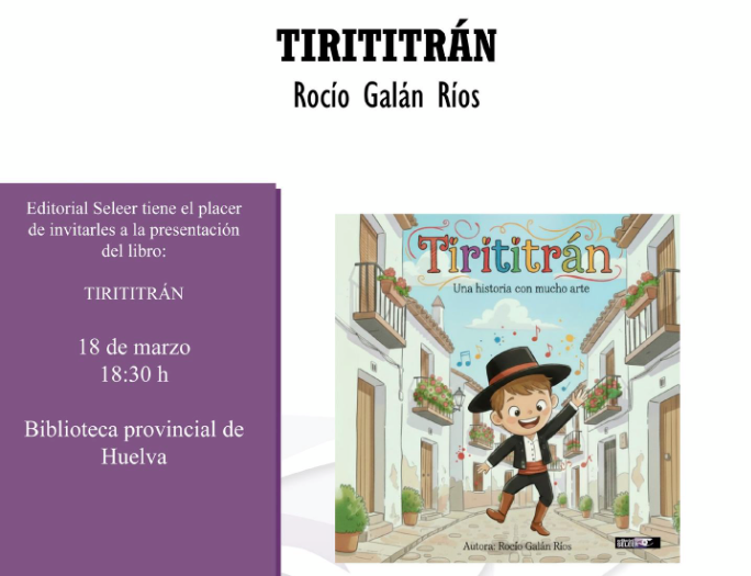 La Biblioteca Provincial del Estado en Huelva acogerá el próximo miércoles 18 de marzo la presentación del libro infantil ‘Tirititrán’, una obra escrita por Rocío Galán Ríos y editada por la Editorial Seleer. El acto comenzará a las 18.30 horas y contará con entrada libre hasta completar aforo.